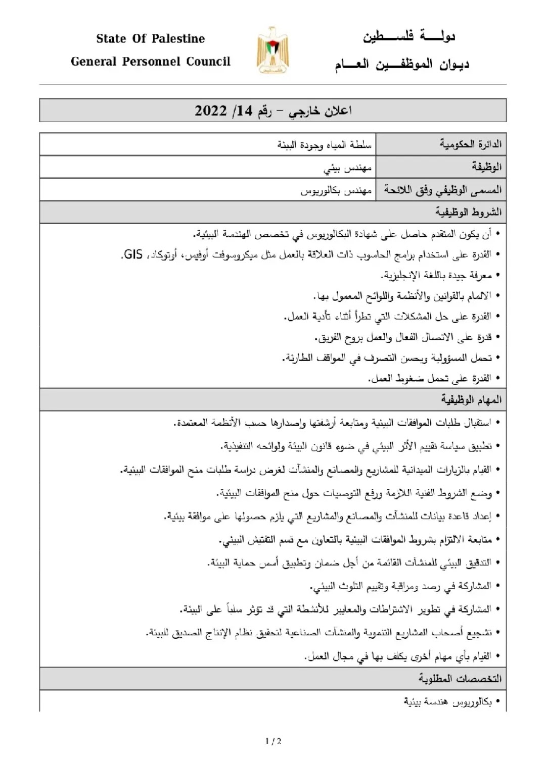 إعلان توظيف صادر عن ديوان الموظفين العام بقطاع غزة يعلن فيه عن وظيفة مهندس بيئي وفق الاعلان الخارجي رقم 14/2022 وذلك حسب ما هو موضح بصور الإعلان بالأسفل.