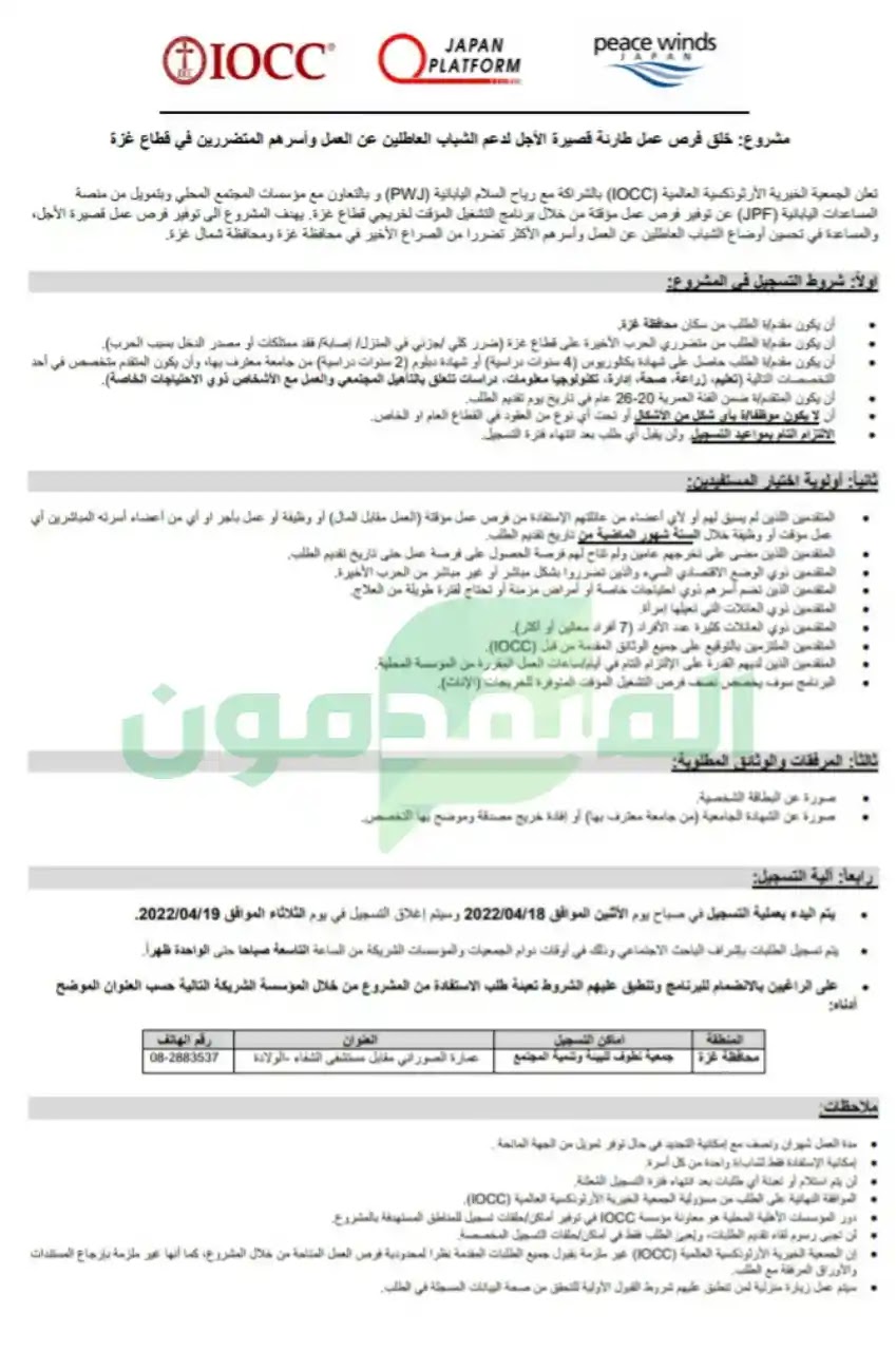 تعلن الجمعية الخيرية الأرثوذكسية العالمية (IOCC) بالشراكة مع رياح السلام البقيلية (PWJ) وبالتعاون مع مؤسسات المجتمع المحلي والعويل من منصة المساعدات اليابانية (JPF) عن توفير فرص عمل موقتة من خلال برنامج التشغيل المؤقت الفريجي قطاع غرة بهدف المشروع إلى توفير فرص عمل قصيرة الأجل، والمساعدة في تحسين أوضاع الشباب العاطلين عن العمل وأسرهم الأكثر تضررًا من الصراع الأخير في محافظة غزة ومحافظة شمال غزة.