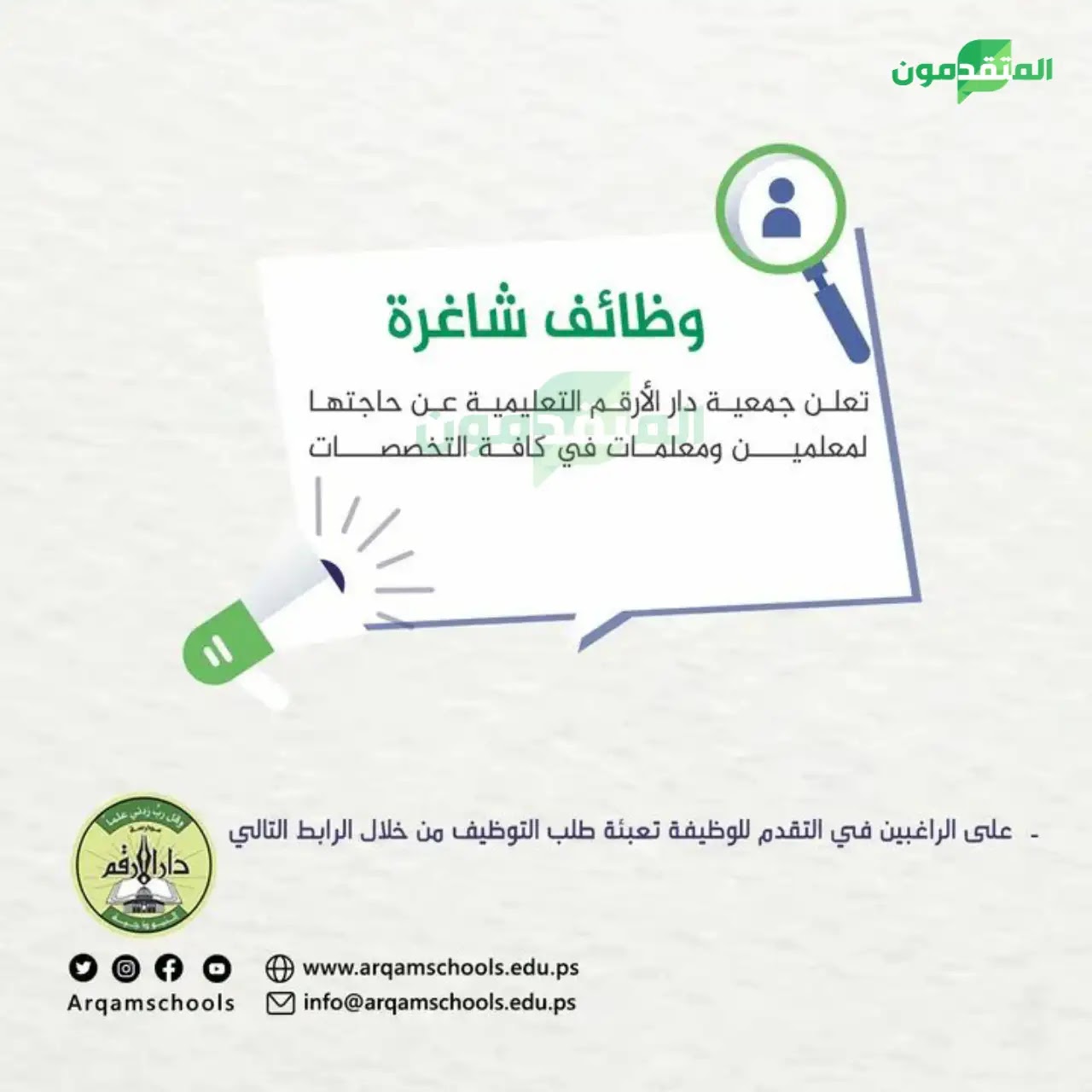متابعو موقع المتقدمون نعرض لكم مجموعة من الوظائف الشاغرة التي وصلت "المتقدمون" نسخة عنها والصادرة عن مدارس دار الأرقم النموذجية.